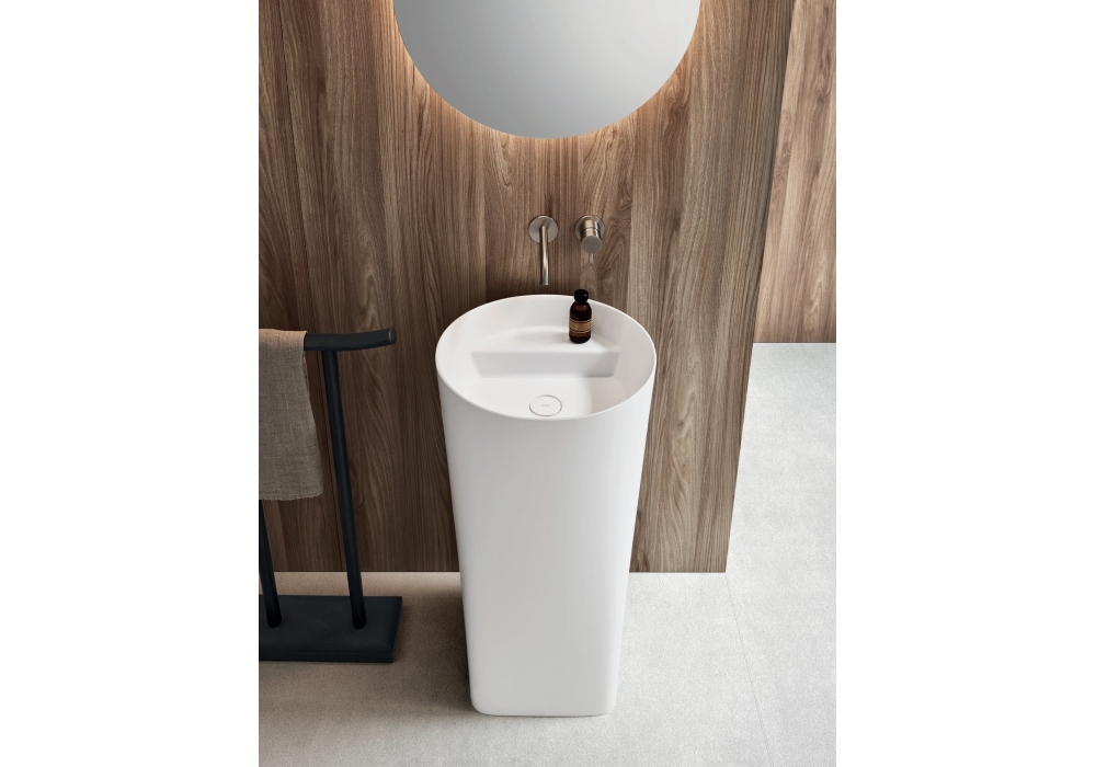 Azuma 19.03 firmato da Lievore Altherr per Noorth è un sistema bagno realizzato con monolite a terra in cristalplant, appendino e portasciugamano da terra in rovere carbone. Pouff in sughero naturale e nero, specchiera con retroilluminazione a LED e rubinetteria in acciaio inox satinato.