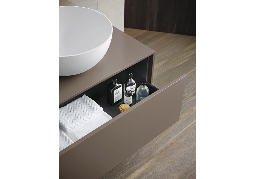 Sintesi 19.07 firmato da Michele Marcon per Noorth è un sistema bagno realizzato con lavabi in appoggio in cristalplant, basi con apertura push-pull, top e fianchi in laccato castoro opaco con vano a giorno in rovere carbone. Specchiere con retroilluminazione a LED. Colonne con struttura e vano a giorno in rovere rarbone, ante in laccato castoro opaco. Consolle, portasciugamani nero e rubinetteria in acciaio inox satinato.