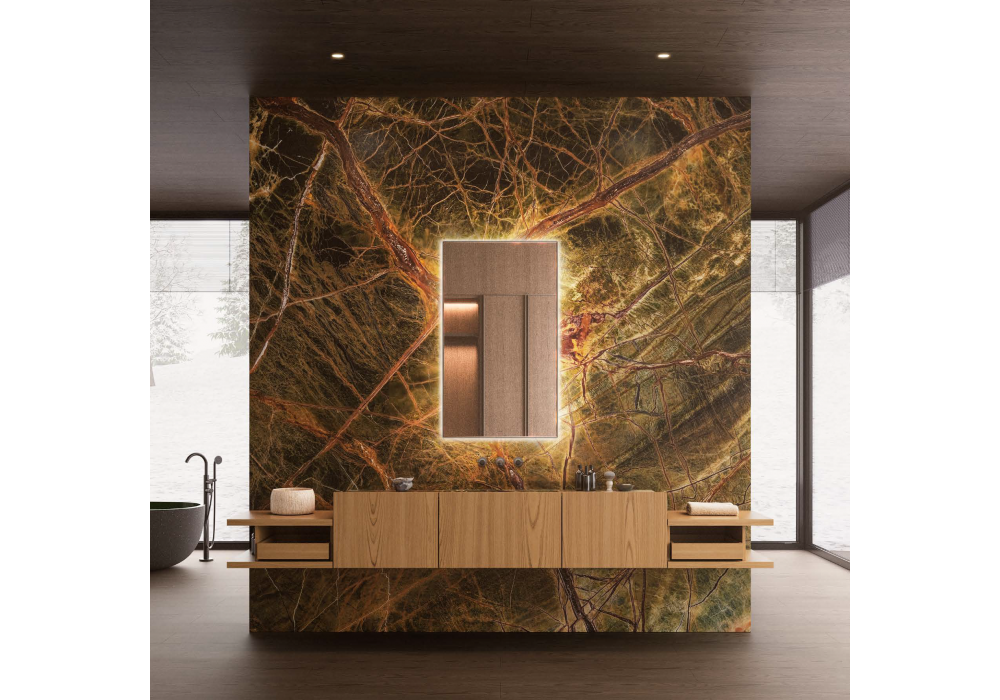 Framis firmato da Vincent Van Duysen per Molteni&C è un sistema bagno caratterizzato dal calore del rovere ambra, in contrasto con il marmo Rain Forest Green utilizzato per top e lavelli integrati. La base con elementi a giorno laterali crea un dinamico gioco di livelli e superfici d’appoggio. Completano l’ambiente la vasca Ero in pietra lava con interno smaltato verde, lo specchio Eidon retroilluminato con cornice peltro e la rubinetteria Flora, per un insieme raffinato e contemporaneo.