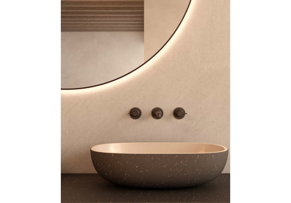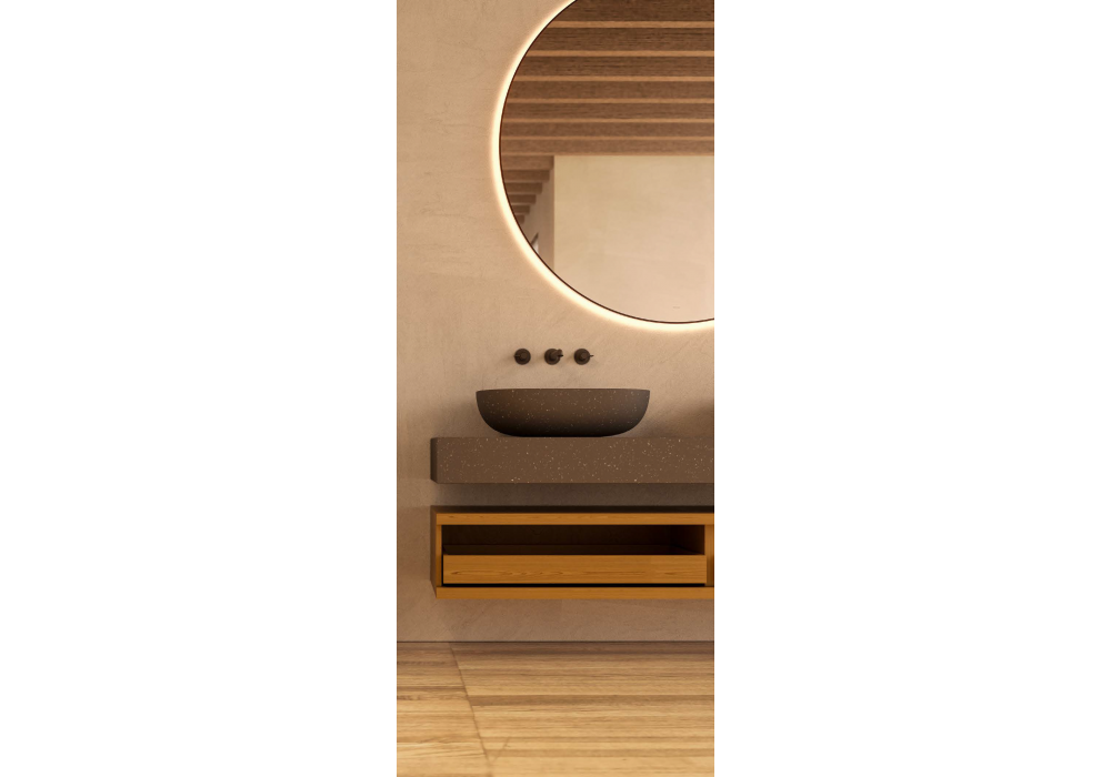 Framis firmato da Vincent Van Duysen per Molteni&C è un sistema bagno caratterizzato da un top sospeso in pietra lavica che si integra con i lavabi Ero, con esterno in pietra lavica e interno craquelé. La base a giorno con cassetti in rovere sunrise è sospesa e distaccata dal piano, creando un effetto visivo leggero e contemporaneo. Completa l’ambiente lo specchio rotondo retroilluminato e la rubinetteria Flora, per un insieme essenziale ed elegante.