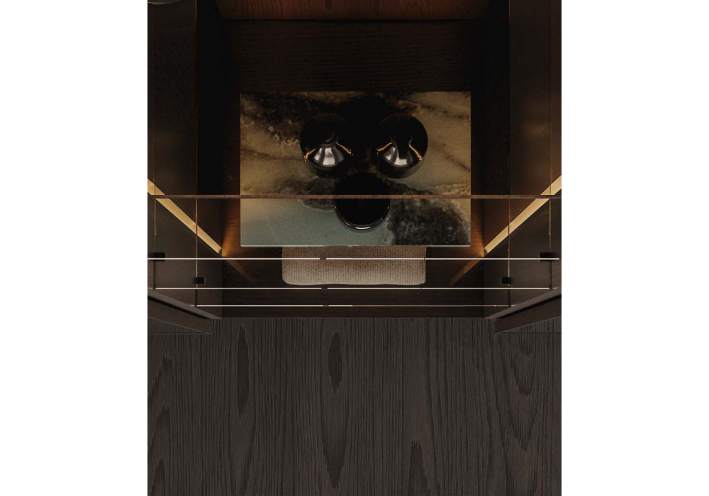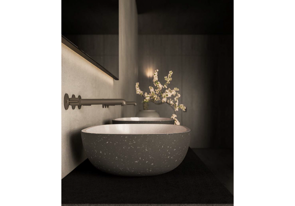 Ratio firmato da Vincent Van Duysen per Molteni&C è un sistema bagno dai toni scuri e sofisticati, con basi sospese Ratio in rovere nero e top in pietra lavica da 150 mm parzialmente sospeso. I lavabi Ero in appoggio, con esterno in pietra lavica e interno craquelé, creano un elegante contrasto materico. La parete è completata da colonne sospese con moduli in vetro e ante Flair, integrate da illuminazione verticale. Lo specchio rettangolare retroilluminato e la rubinetteria Flora definiscono l’area lavabo, mentre la panca Tibeau aggiunge un tocco di comfort e stile.