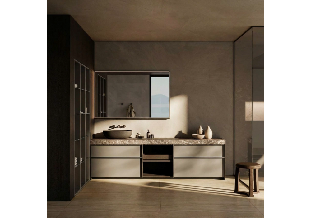 Ratio firmato da Vincent Van Duysen per Molteni&C è un sistema bagno con base a terra in rovere caffè e profili peltro, caratterizzata da moduli a giorno con cassetto che valorizzano la geometria del sistema Ratio. Il top in Sant’Anna Grey ospita il lavabo d’appoggio Ero in pietra lavica con interno smaltato blu, vero punto focale dell’ambiente. Completano lo spazio lo specchio rettangolare retroilluminato, la colonna a giorno contenitiva e la rubinetteria Flora.