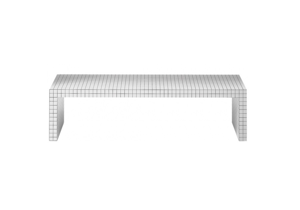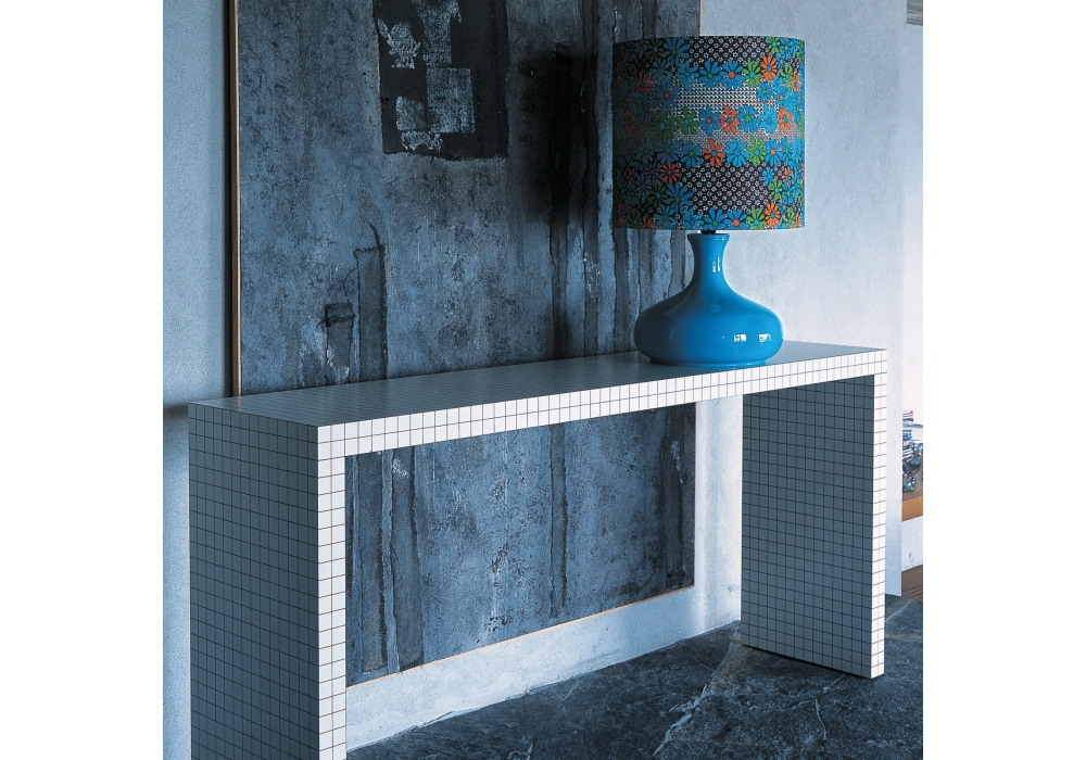 710 Quaderna firmata da Superstudio per Zanotta è una consolle con struttura in legno tamburato placcato in laminato Print, colore bianco, stampato in serigrafia a quadretti neri con interasse di 3 cm.