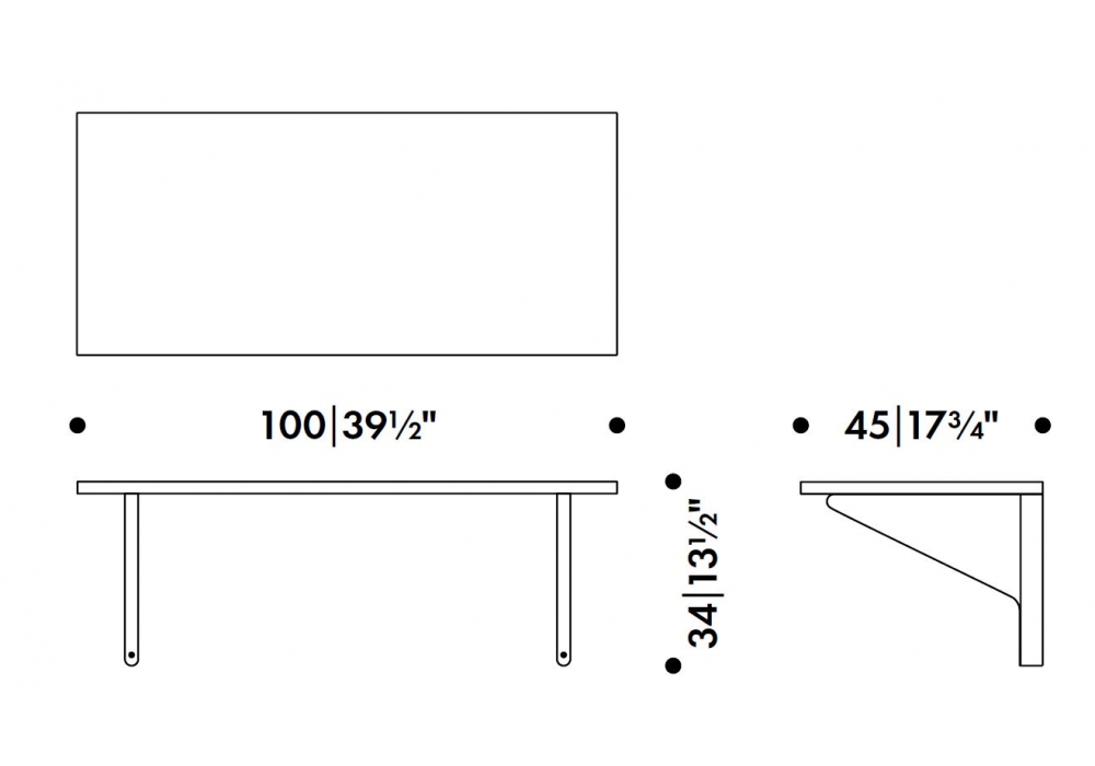 La Consolle REB 006 Kaari disegnata da Ronan & Erwan Bouroullec per Artek, fa parte della collezione Kaari. Pannello con superficie in linoleum (spessore circa 24 mm), bordo in ABS. Supporto a parete in massello di rovere naturale con vernice protettiva o tinto nero con vernice protettiva, acciaio laminato a polvere verniciato a polvere nera.