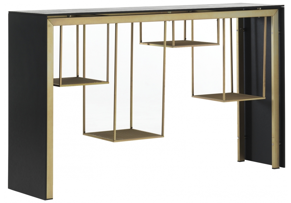 Tokyo firmata da Idelfonso Colombo per Mogg è una consolle con struttura in metallo e vani in lamiera stirata verniciati oro opaco. Piano e fianchi in MDF colore nero.