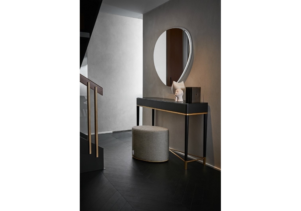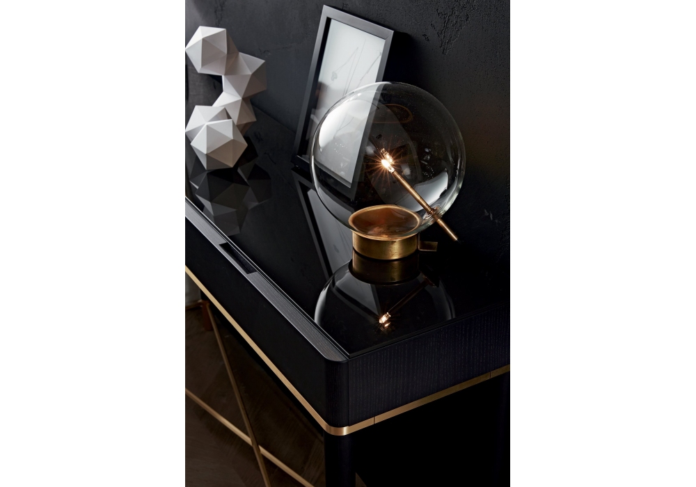 Tama firmata da Carlo Colombo per Gallotti&Radice è una consolle con cassetti in frassino tinto nero poro aperto con parti metalliche laccate ottone satinato. Top in cristallo 6mm temperato retroverniciato liquirizia brillante.