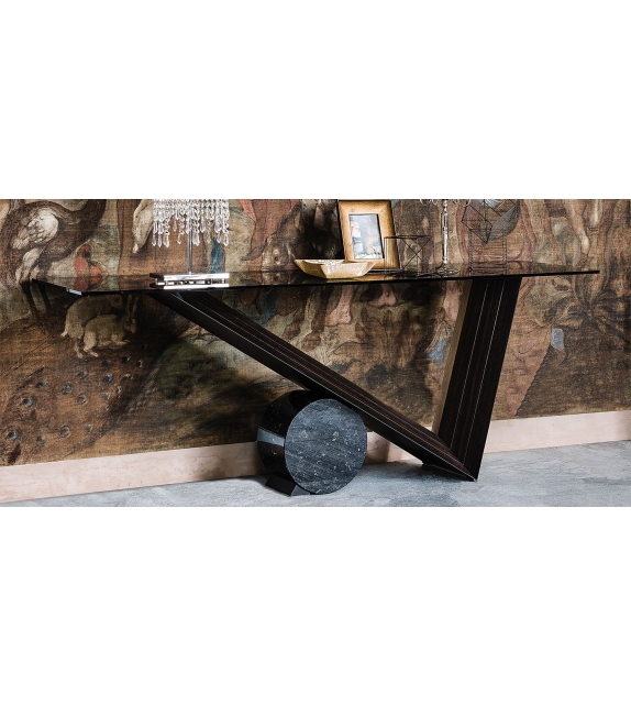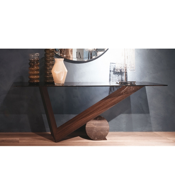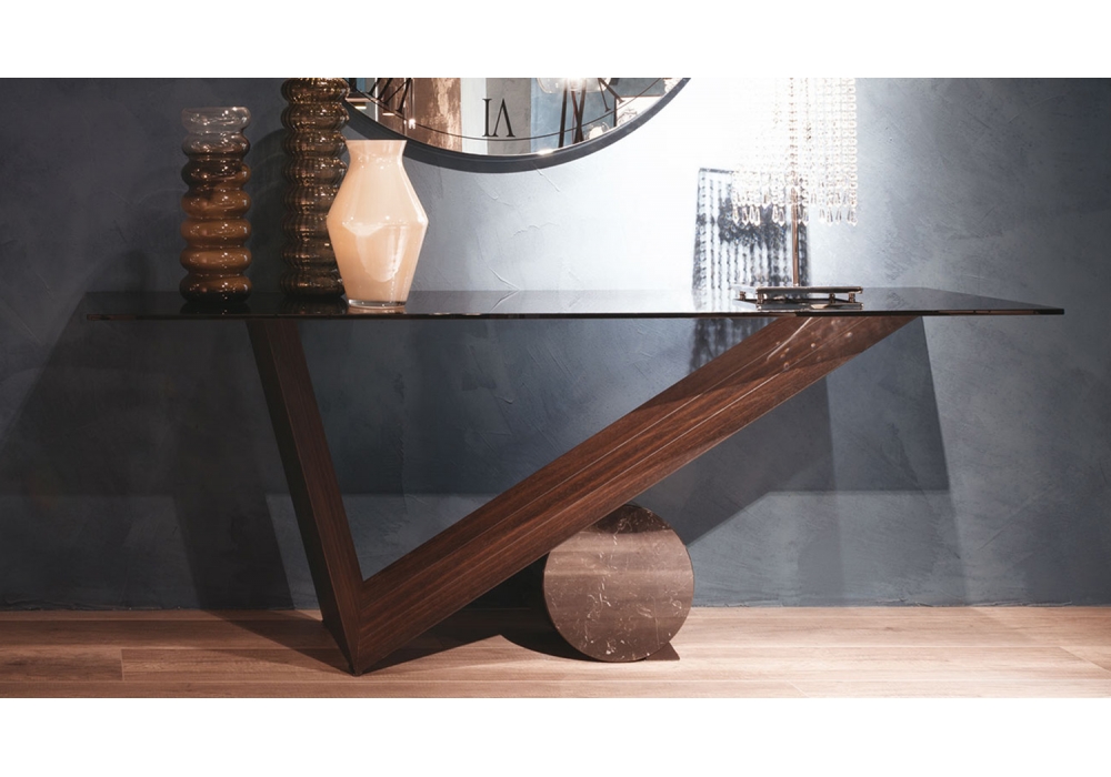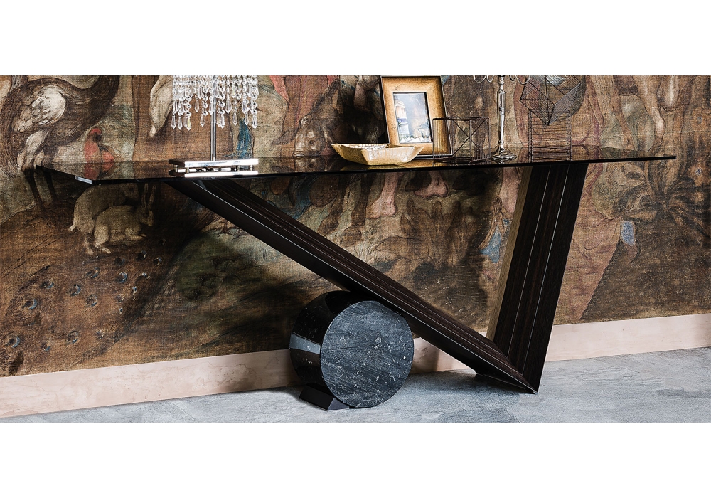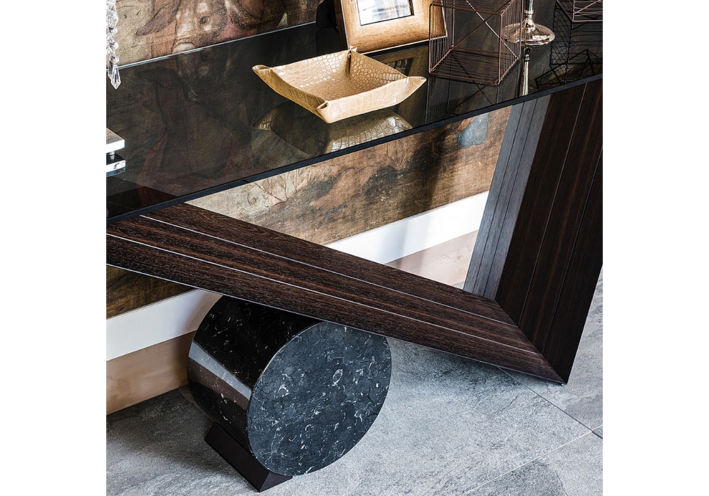 Valentino firmata da Emanuele Zenere per Cattelan Italia è una consolle con base in legno di noce Canaletto o rovere bruciato. Cilindro in marmo disponibile in tre finiture. Piano in appoggio in cristallo 12mm. Disponibile in diverse dimensioni.