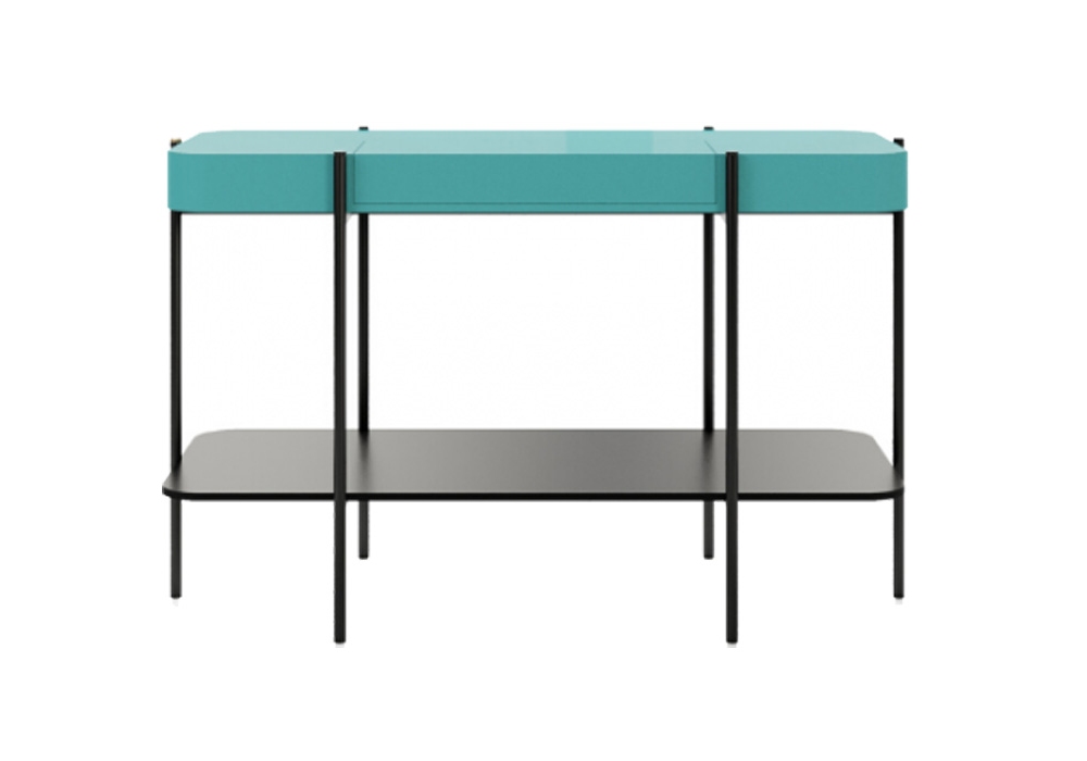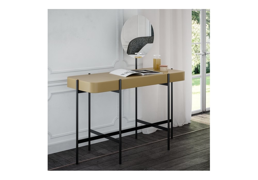 Caillou firmato da Liu Jo Living Collection è una scrivania, una consolle o un set per il trucco. Struttura in legno MDF. Piedino in metallo verniciato a polvere. Disponibile in laccato o effetto legno.