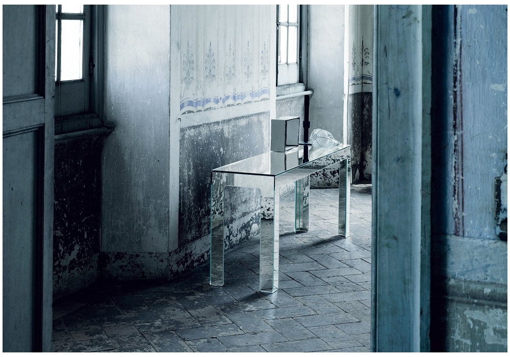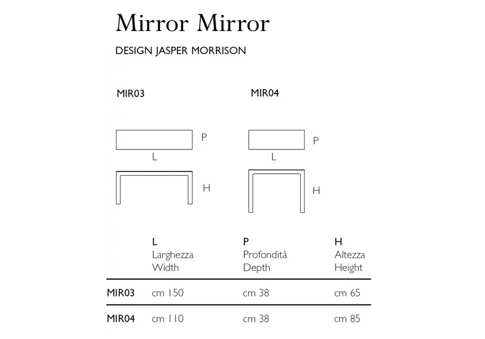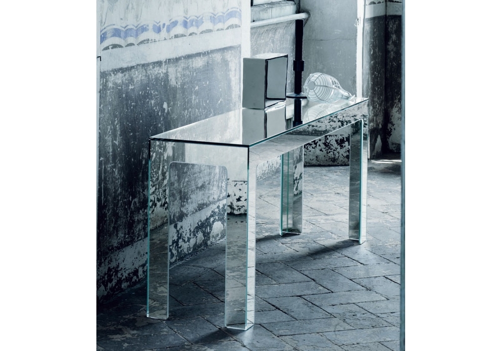 Mirror Mirror firmata da Jasper Morrison per Glas Italia è una consolle disponibile in diverse misure, la cui base è realizzata incollando a 45° lastre di specchio stratificato bifacciale, tagliato a getto d'acqua. Il piano è in appoggio sulla base.