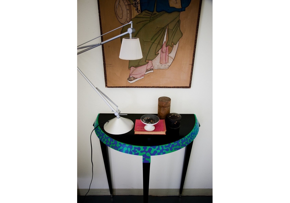 7400 Agrilo firmata da Alessandro Mendini per Zanotta Edizioni è una consolle con struttura in legno laccato, colore nero. Bordo decorato a mano, colori blu e verde. Piedini in ottone argentato e piano in cristallo verniciato, colore nero.