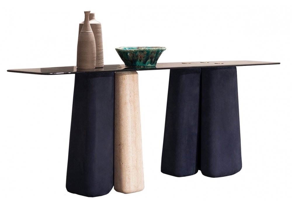 Fany firmata da Christophe Delcourt per Baxter è una consolle realizzata con gambe in marmo Travertino White opaco e in polimex con rivestimento in pelle. Dettagli in metallo con vernice opaca e piano in vetrofusione. Disponibile in diverse finiture e dimensioni.