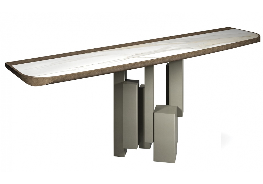 Skyline Keramik Premium firmata da Paolo Cattelan - BrogliatoTraverso per Cattelan Italia è una consolle realizzata con base in acciaio laccato goffrato. Piano in ceramica Marmi in diversi colori con profilo inferiore arrotondato e verniciato Brushed Bronze o Brushed Grey.