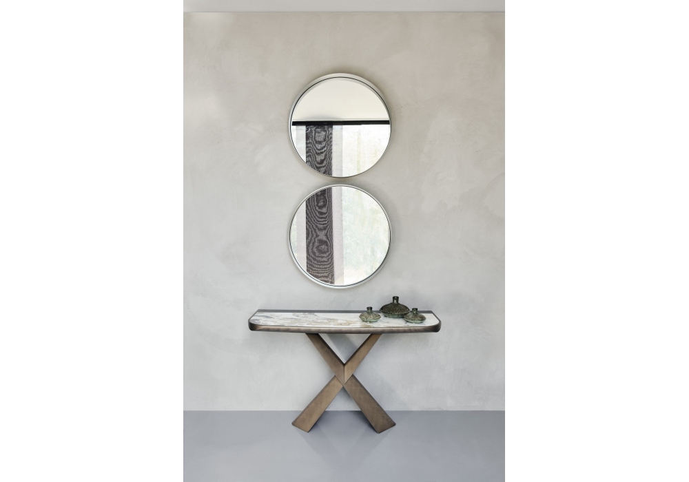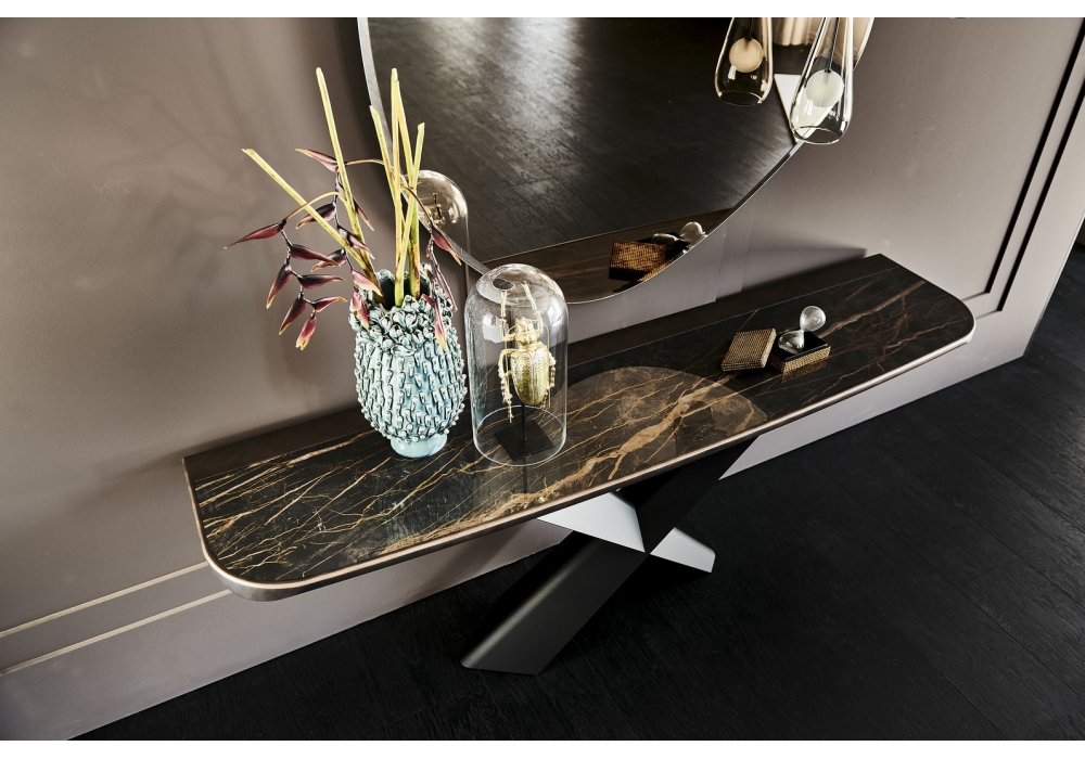 Skyline Keramik Premium firmata da Paolo Cattelan - BrogliatoTraverso per Cattelan Italia è una consolle realizzata con base in acciaio laccato goffrato. Piano in ceramica Marmi in diversi colori con profilo inferiore arrotondato e verniciato Brushed Bronze o Brushed Grey.