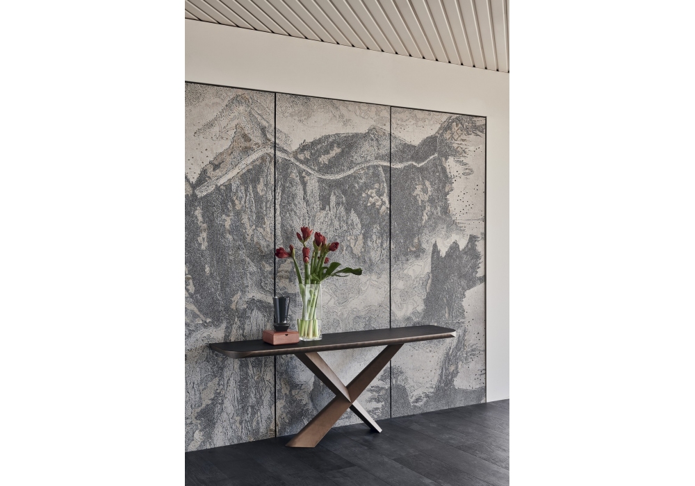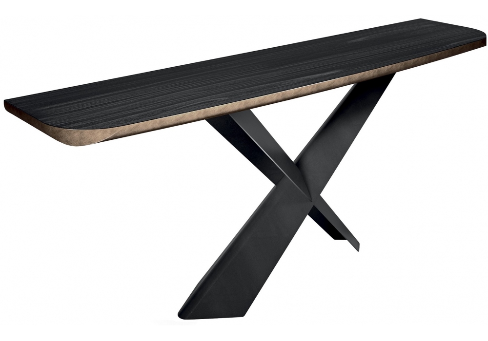 Terminal Wood-C firmata da Paolo Cattelan per Cattelan Italia è una consolle realizzata con base in acciaio laccato goffrato. Piano in legno con profilo inferiore arrotondato e verniciato Brushed Bronze o Brushed Grey.