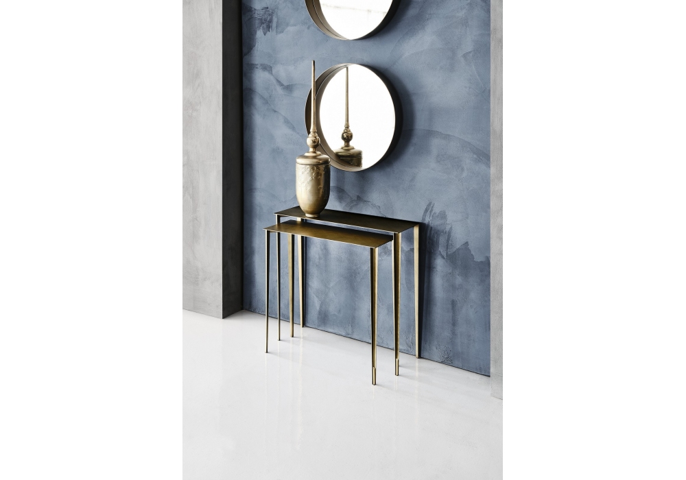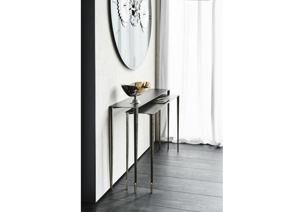 Etoile firmato da Giorgio Cattelan per Cattelan Italia è un set di due consolle disponibili in due altezze. Struttura in acciaio laccato nei seguenti colori: Brushed Brass, Brushed Bronze o Brushed Grey. Dettagli in ottone.