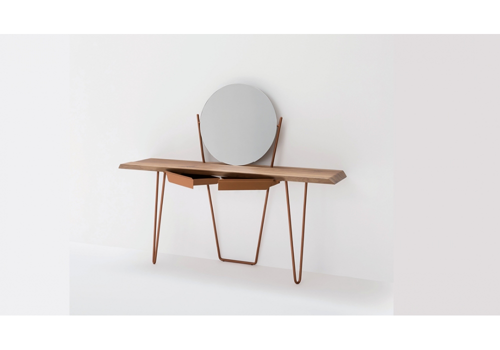 Coseno firmata da Mauro Lipparini per Bonaldo è una consolle con base in metallo verniciato e piano in legno. E' dotata di uno specchio circolare orientabile e, nel modello Coseno Plus, anche di cassetti in metallo nella stessa finitura della base.