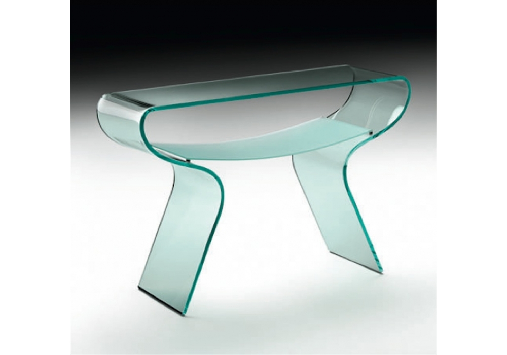 Charlotte firmata da Prospero Rasulo per Fiam è una consolle in vetro curvato. Disponibile anche nella versione con ripiano di appoggio in vetro curvato acidato.