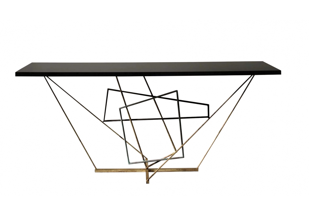 Rhomboid firmata da Gareth Devonald Smith per Porta Romana è una consolle di forma quadrangolare strutturata da quadralini di metallo che formano composizioni geometriche intrecciate. Il piano è in legno laccato di colore nero.