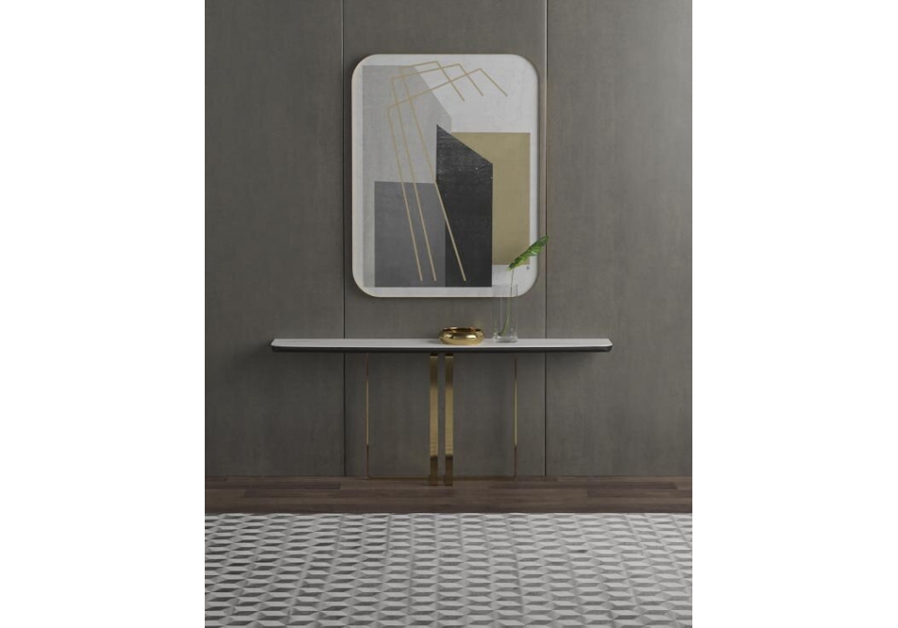 Theron firmata da Gualter Torres per Gual Design è una consolle con struttura in ferro verniciato nero o acciaio inox dorato e piano rivestito in ceramica Calacatta o Marquina.