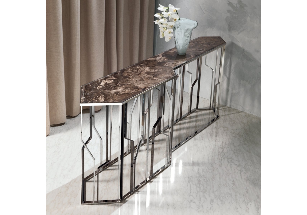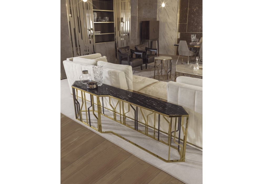 Ginza firmata da Alessandro La Spada per Longhi è una consolle con struttura in metallo lucido o opaco, e piano in marmo, specchio o rivestito in pelle. Disponibile in differenti dimensioni.