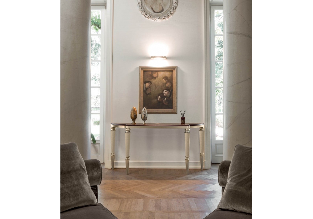 Laurie firmata da Giuseppe Iasparra per Longhi è una consolle con piano in marmo o ebano opaco con intarsio. Parti metalliche sottopiano e gambe in finitura lucida o opaca. Inserto gambe in pelle o su richiesta in marmo.