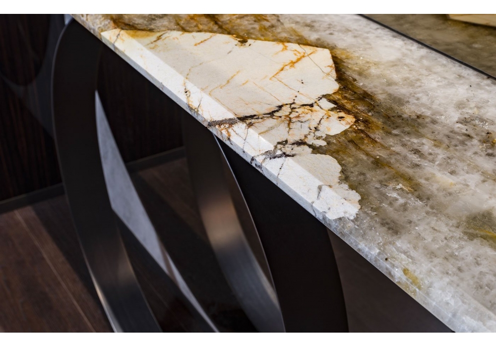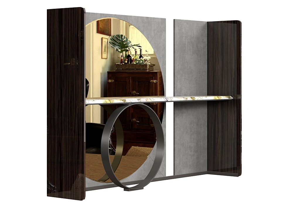 Note firmato da Ben Wu per Longhi è una consolle con struttura in legno in essenza, rivestimento interno in pelle con specchio rotondo in diverse finiture. Il piano è in marmo o specchio e poggia su un anello in metallo rettificato. Disponibile in differenti dimensioni.