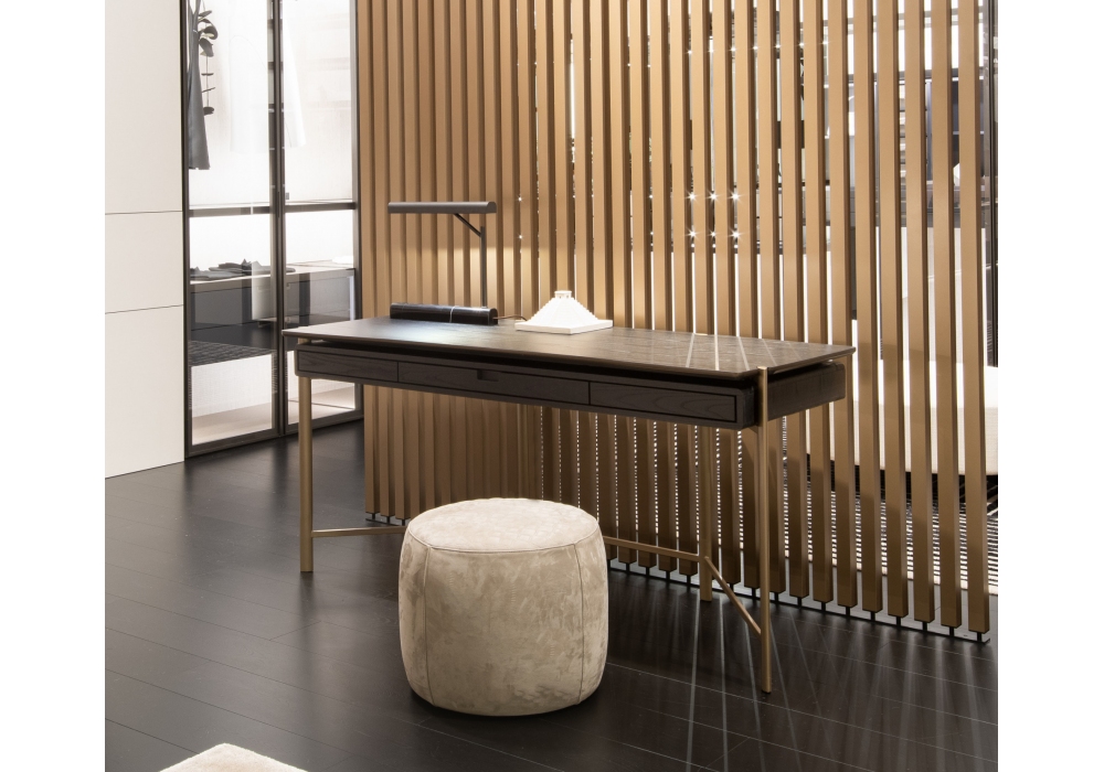 Eros firmata da Studio 63 per MisuraEmme è una consolle realizzata con struttura in metallo bronzo dorato, contenitore in essenza rovere nero e piano in marmo o in essenza.