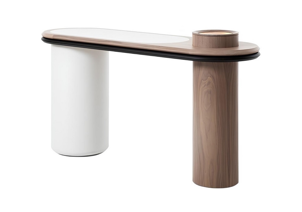 Liz firmata da Silvia Musetti per Giorgetti è una consolle realizzata in noce canaletto e parti rivestite in pelle. Disponibile in diverse finiture e con possibilità di aggiunta del LED.