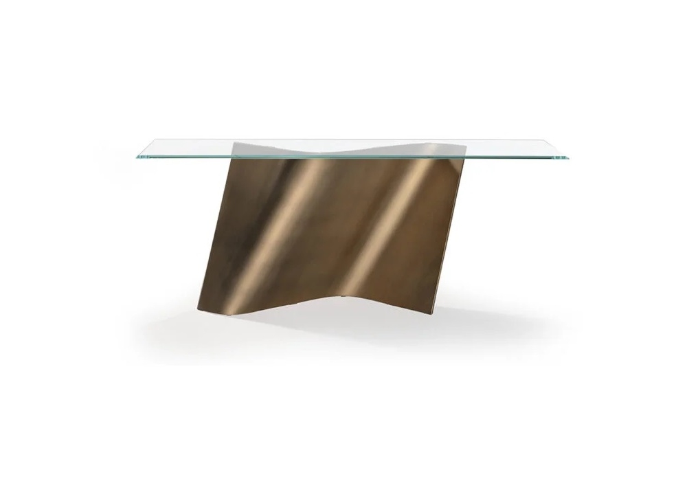 Esse firmata da Tulczinsky per Reflex Angelo è una consolle con base in vetro extrachiaro curvato nelle finiture Bronzo, Ottone, Ottone scuro e Titanio. Piano rettangolare in vetro trasparente o extrachiaro.