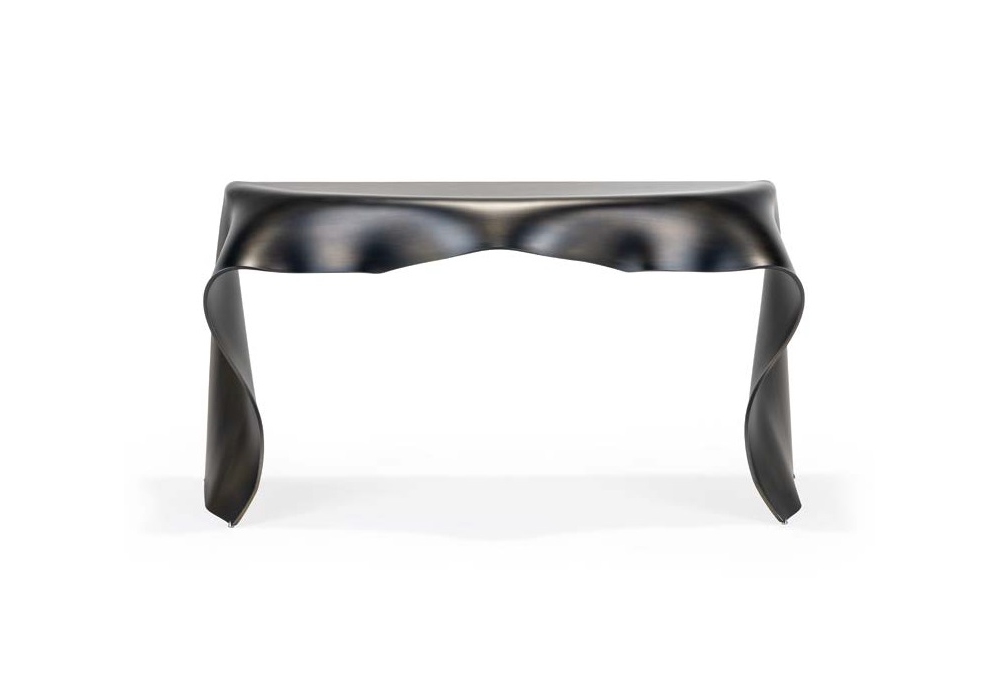 Foulard firmata da Reflex Angelo è una consolle in vetro curvato extrachiaro, bronzo o fumé con finitura esterna acidata. Disponibile anche con finitura esterna ottone satinato o ottone scuro oppure laccato lucido nei colori Venezia.