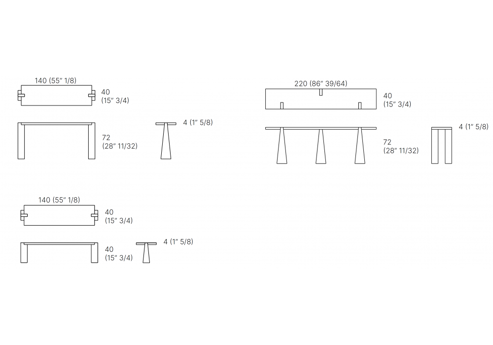 | Dimensioni | 140 x 40 x H 72 cm; 220 x 40 x H 72 cm; 140 x 40 x H 40 cm. |