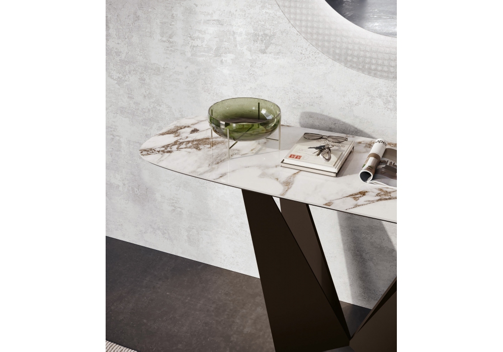 Eiffel firmata da Signorotto+Partners per Dall'Agnese è una consolle realizzata con struttura in metallo e piano disponibile in legno, in vetro laccato oppure in Gres accoppiato a vetro.