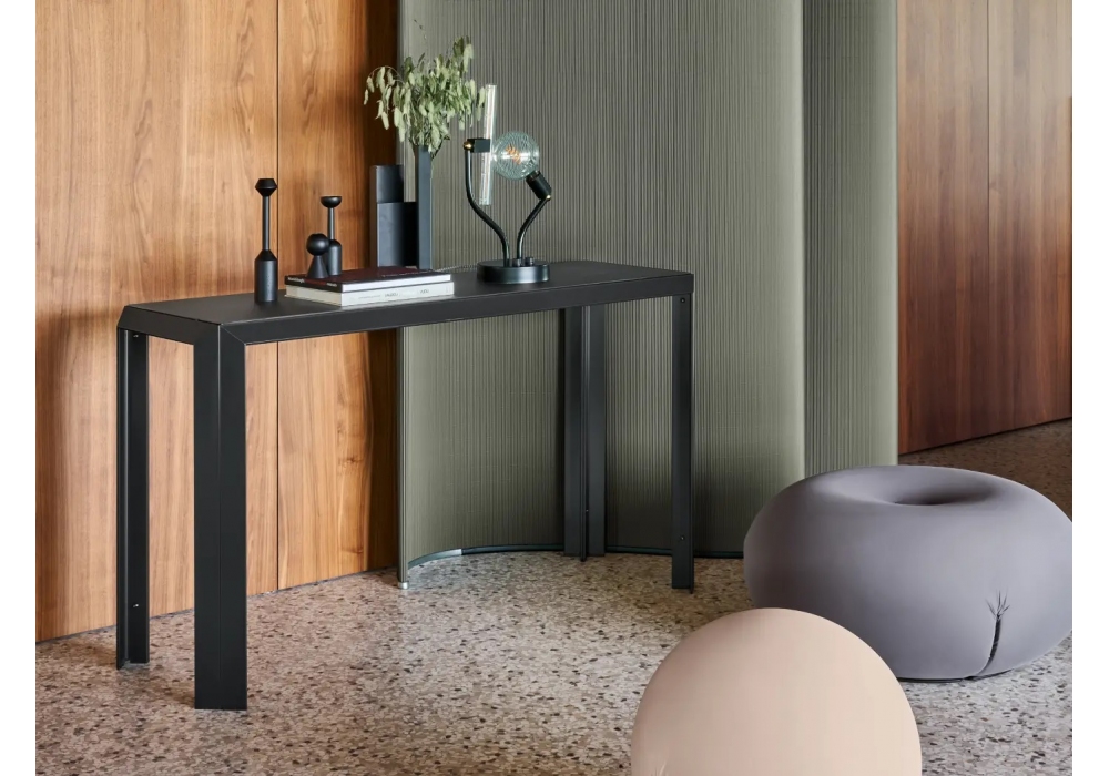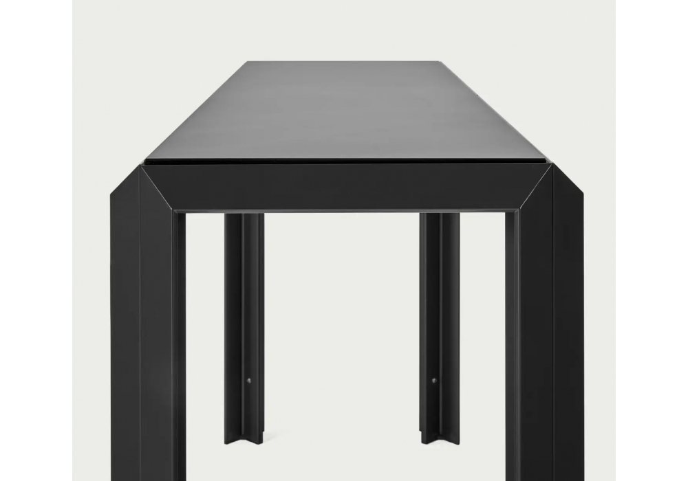 T-Table firmata da Angelo Mangiarotti per Baleri Italia è una consolle con struttura realizzata con profili in alluminio estruso verniciato nei colori indicati. Piano con bordi smussati inserito a filo nella struttura, disponibile in cristallo temperato acidato traslucido o acidato fumé (spessore 12 mm), marmo di Carrara, Marquina, Tundra Grey e in quarzite Taj Mahal (spessore 20 mm). Piedini in polietilene nero.