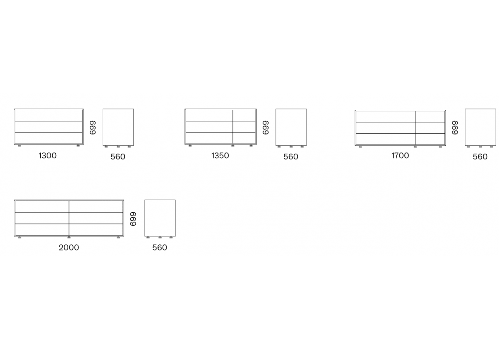 | Dimensioni | 130 x 56 x H 69.9 cm, 135 x 56 x H 69.9 cm; 170 x 56 x H 69.9 cm; 200 x 56 x H 69.9 cm. |