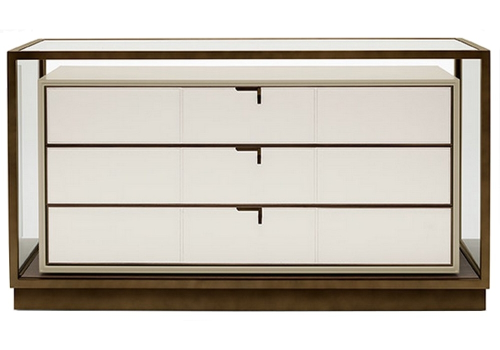 Town firmata da Carlo Colombo per Giorgetti è una cassettiera con struttura esterna in metallo verniciato color bronzo effetto naturale con cristallo trasparente accoppiato con un tessuto metallizzato. La struttura interna in particelle di legno è laccata opaca satinata in 5 colori, con lo schienale impiallacciato in noce canaletto. I bordi e i frontali dei cassetti, con maniglia in metallo, guide scorrevoli a scomparsa ad estrazione totale con rivestimento in cuoio, in diverse finiture.