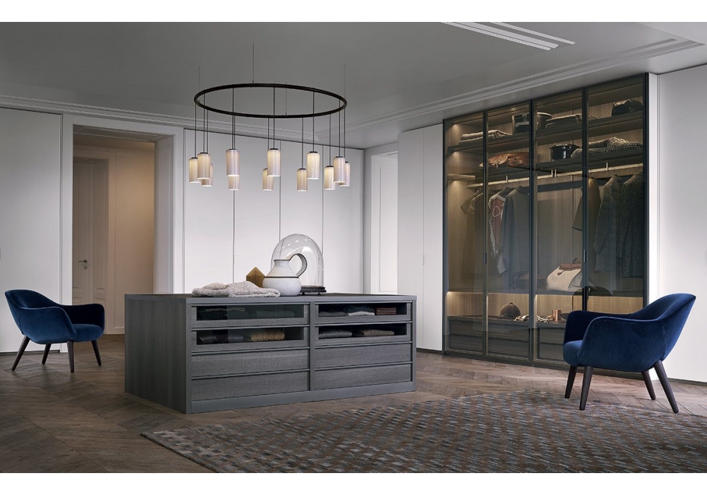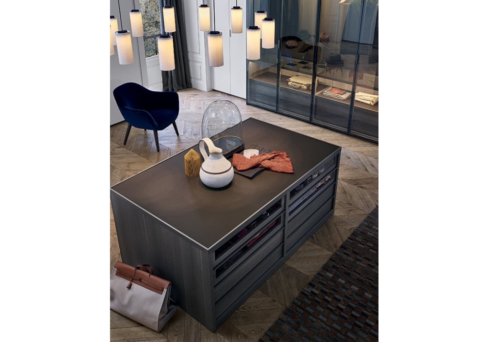 Senzafine firmata da R&D Poliform è una cassettiera a isola con struttura e attrezzatura interna in melamina. Ripiani e fondi dei cassetti con rivestimento in tecnopelle.