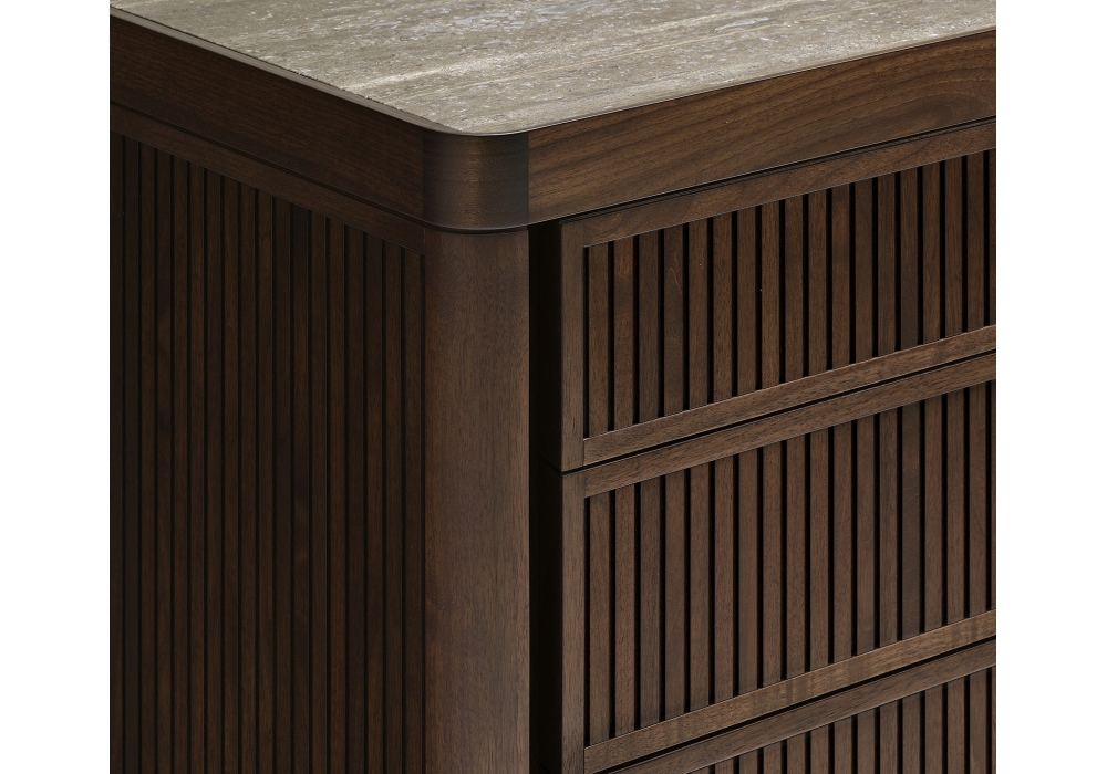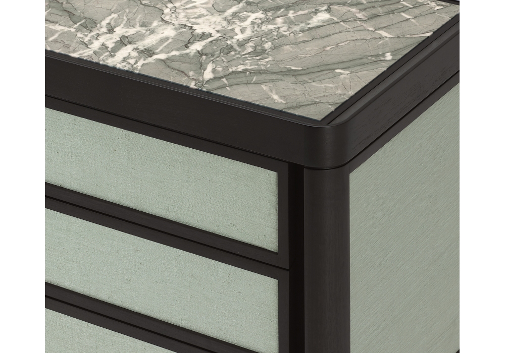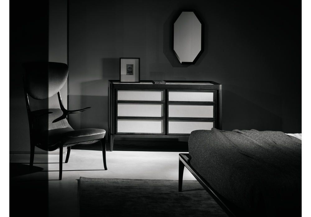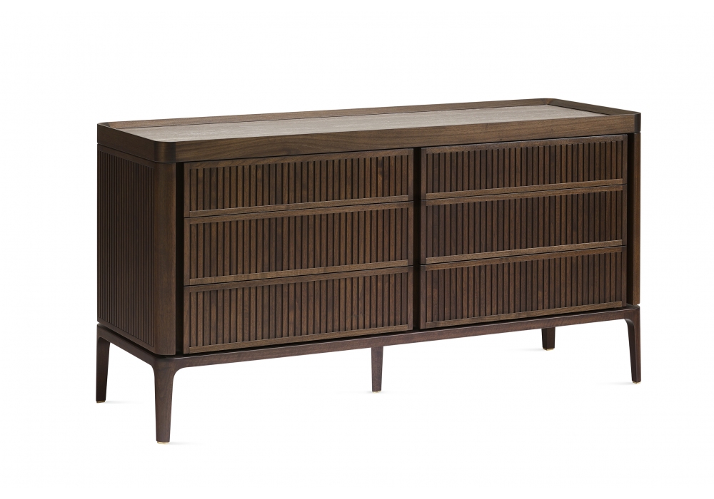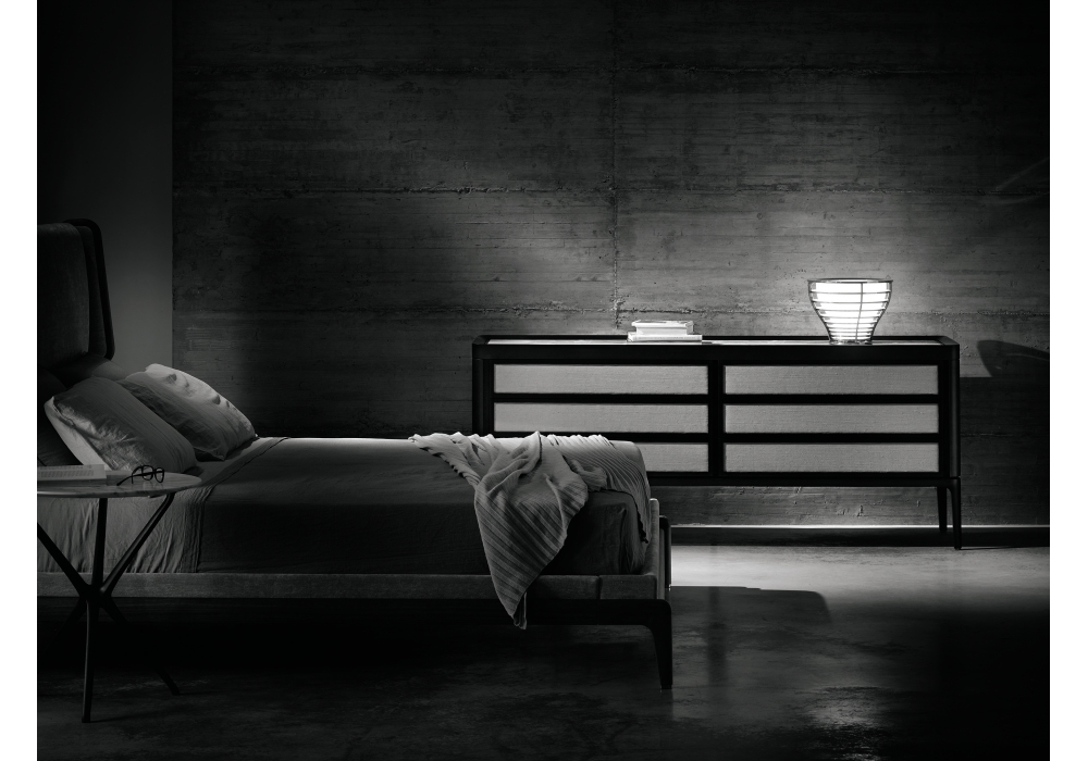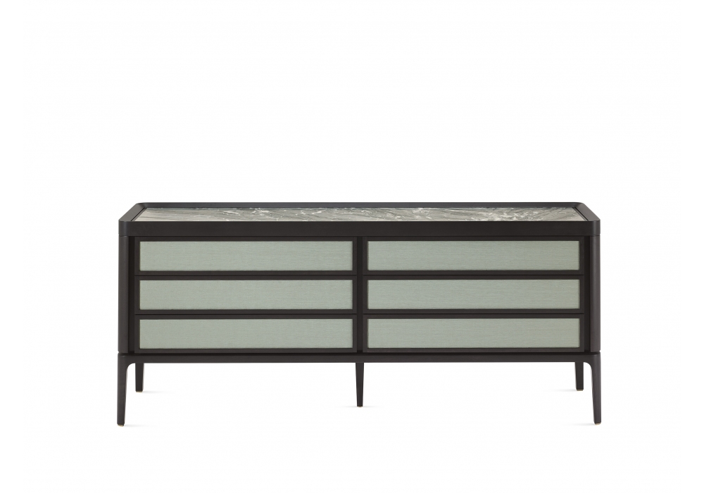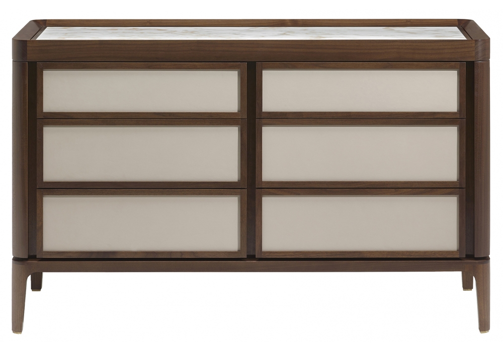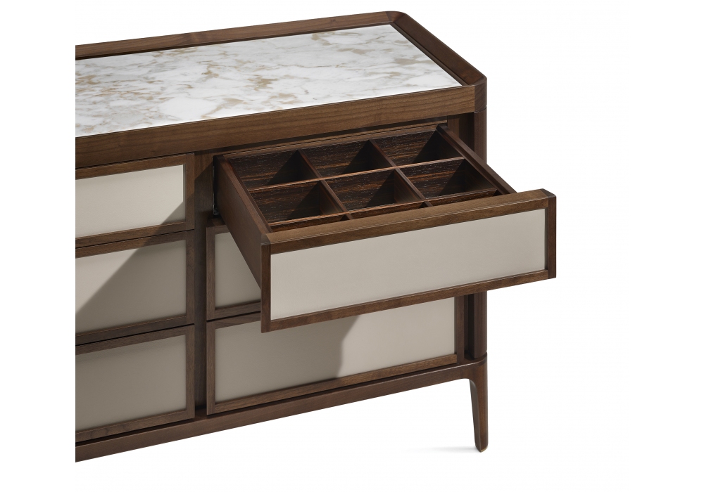 Full firmata da Roberto Lazzeroni per Ceccotti Collezioni è una cassettiera realizzata in massello di noce canaletto, frontali dei cassetti e fianchi rivestiti in noce canaletto, ebano, tessuto, pelle o laccati. Piano in legno, vetro colorato o marmo.