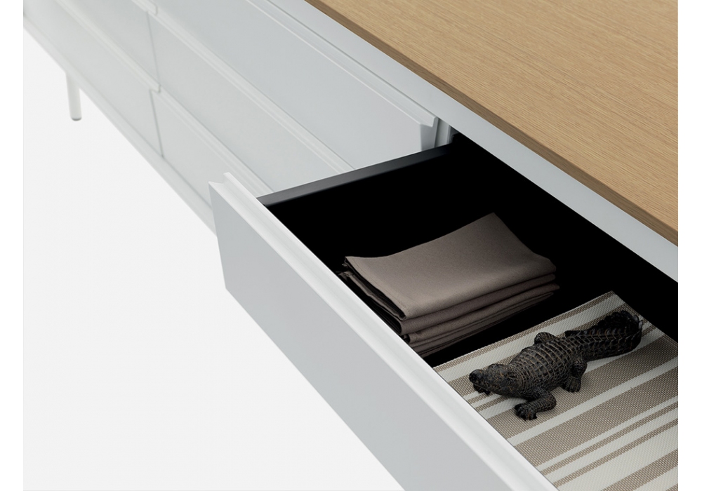 Ali firmata da Salvatore Indriolo per Fantin è una cassettiera in metallo composta da tre o due cassetti e piano in metallo disponibile in diversi colori o in legno nel colore rovere naturale. Struttura disponibile in diverse finiture e in due larghezze.