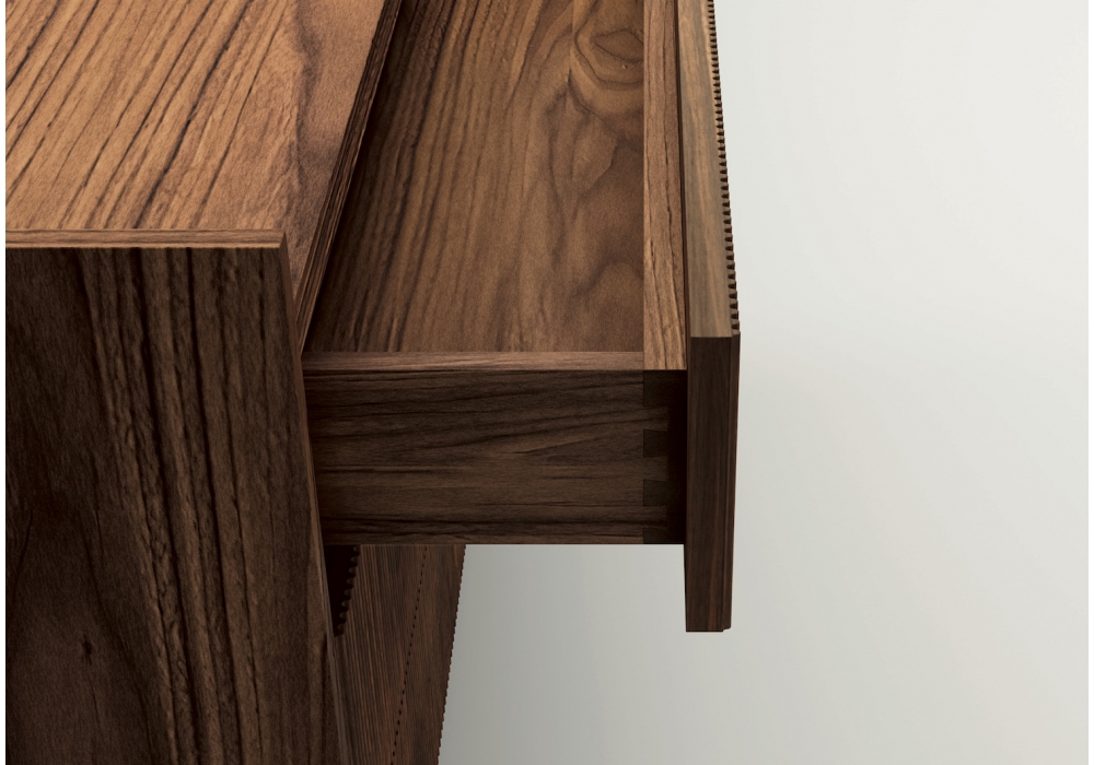 Revo Night Dresser firmata da Giuliano Cappelletti per Riva 1920 è una cassettiera in listellare e legno massello, caratterizzata da una cornice che contiene il top, con cassetti interni realizzati con tradizionale incastro a coda di rondine. La particolare lavorazione verticale dei frontali dei cassetti, Fresart, crea un effetto geometrico moderno e dinamico.