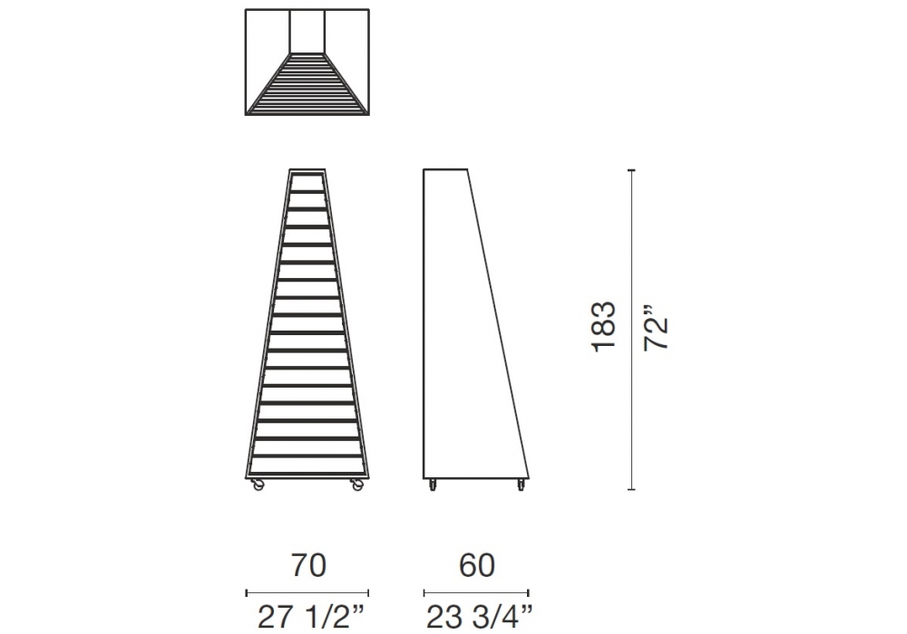 Pyramid firmata da Shiro Kuramata per Cappellini è una cassettiera su ruote con struttura a tronco di piramide in metacrilato trasparente dotata di 17 cassetti in metacrilato nero.
