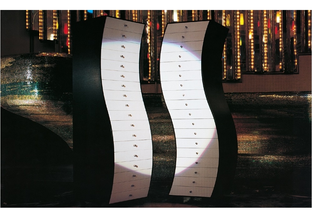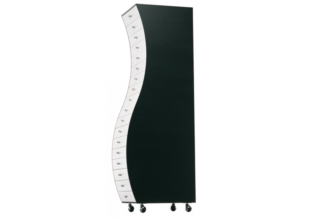 Progetti Compiuti Side 2 firmata da Shiro Kuramata per Cappellini è una cassettiera curva con ruote realizzata con cassetti bianco opaco e struttura in frassino tinto nero.