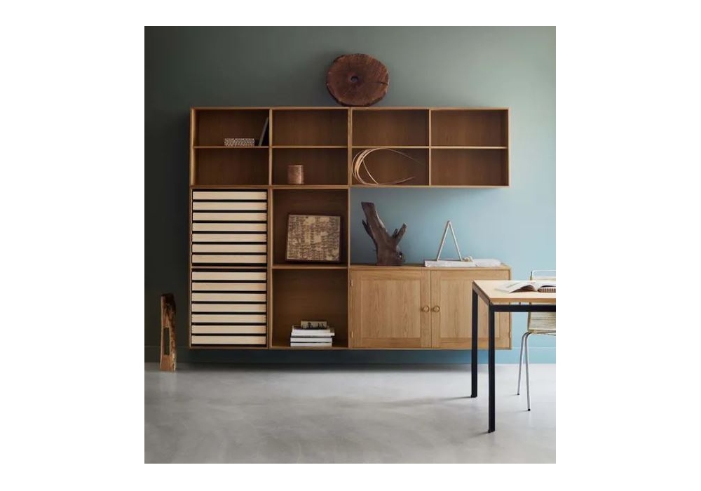 FK63 firmato da Fabricius e Kastholm per Carl Hansen & Søn è un mobiletto con struttura, porte e fondo in legno di rovere impiallacciato. Maniglie e cardiniin ottone. La base è in acciaio verniciato nero.