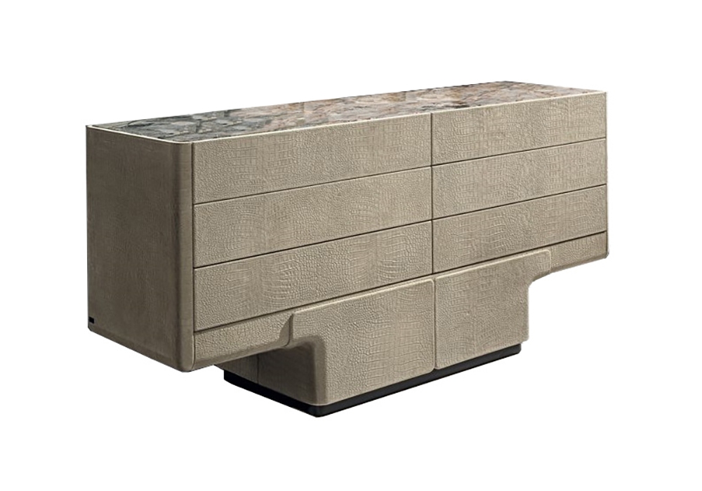 Do firmata da Ben Wu per Longhi è una cassettiera con 6 cassetti con base in vetroresina a stampo manuale. Zoccolatura in metallo rettificato lucido o opaco e piano in legno in essenza o marmo. Struttura in MDF con sagomatura rivestita in pelle. Aperture push-pull e interni laccati color bronzo opaco.