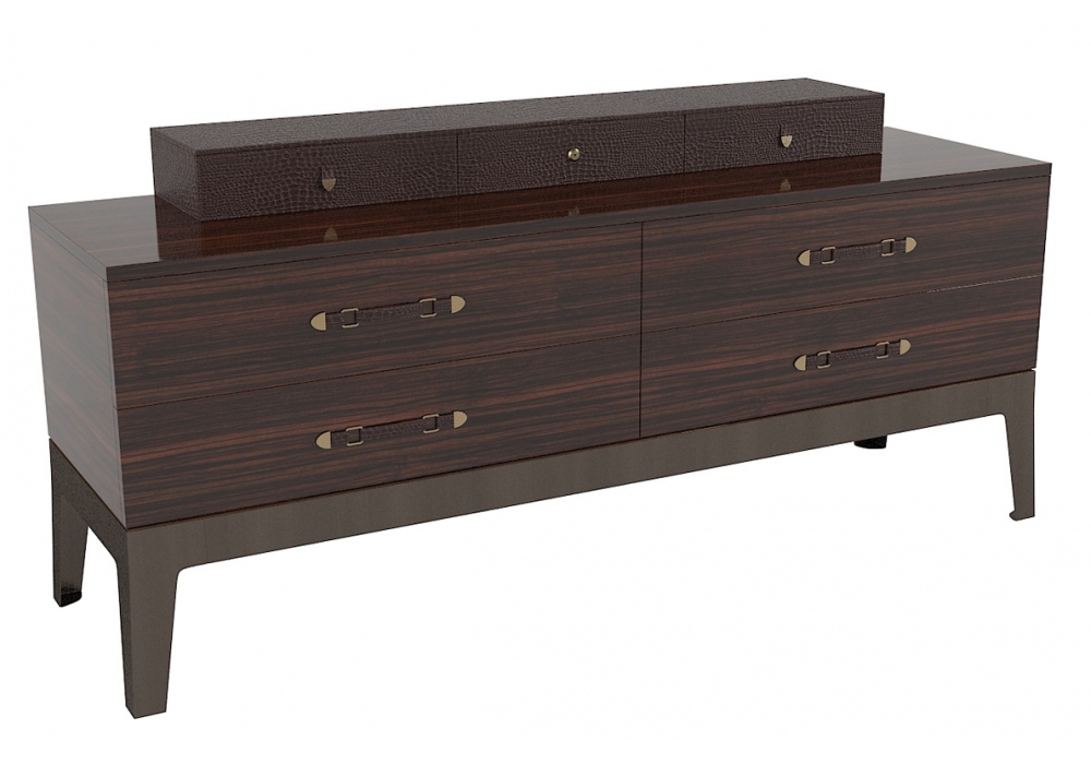 Monsieur firmata da Giuseppe Viganò per Longhi è una cassettiera con 4 cassetti, struttura in legno in essenza o laccato lucido e base in metallo rettificato tagliato al laser in finitura lucida o opaca. L' elemento superiore a tre cassettini è tutto rivestito in pelle. Il cassettino centrale è dotato di serratura.