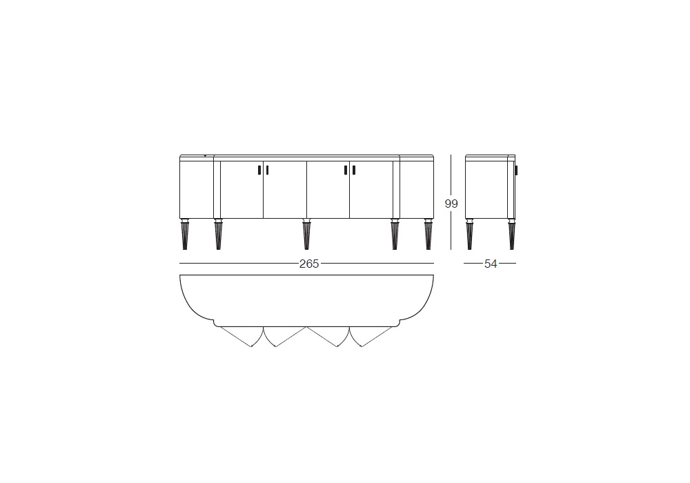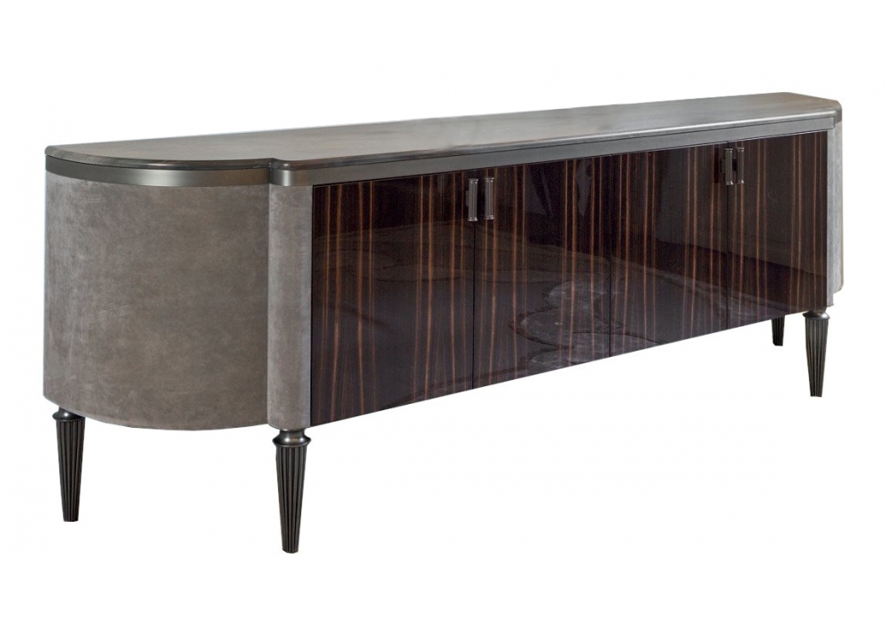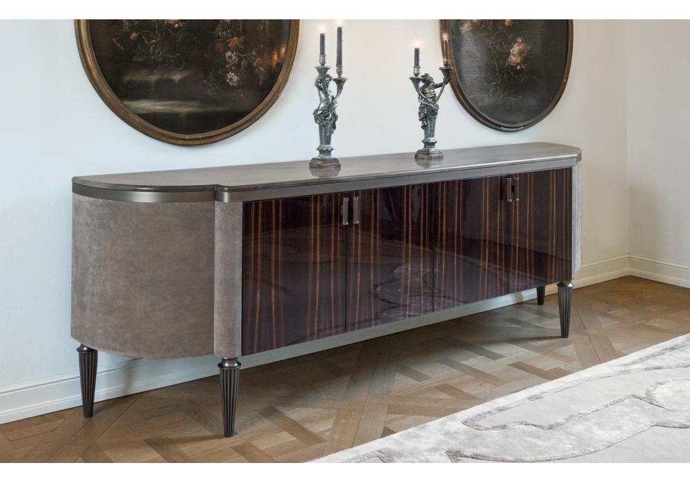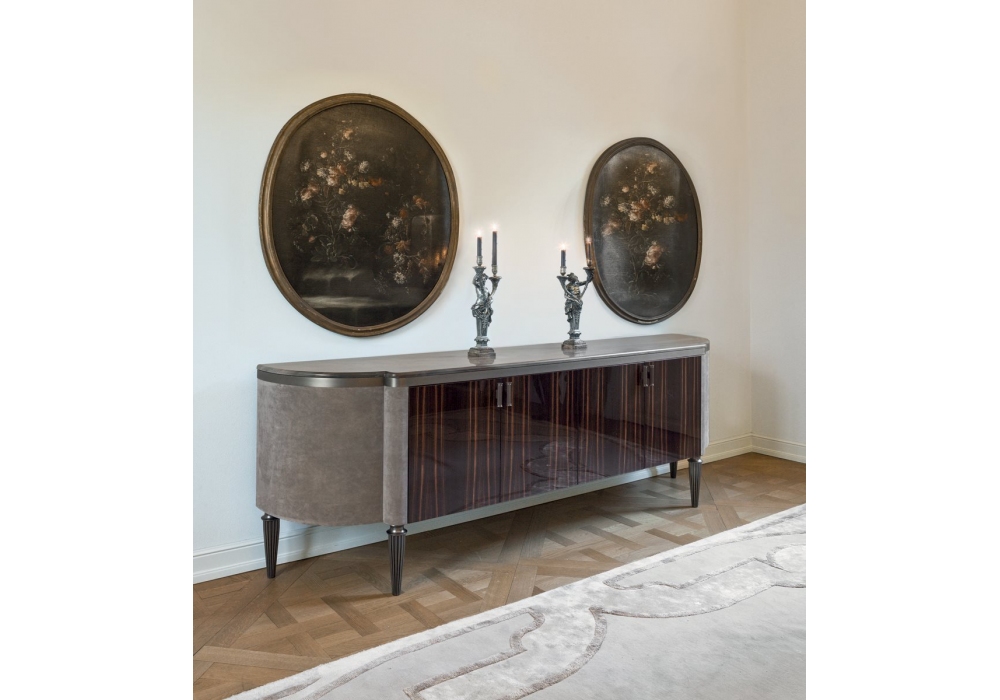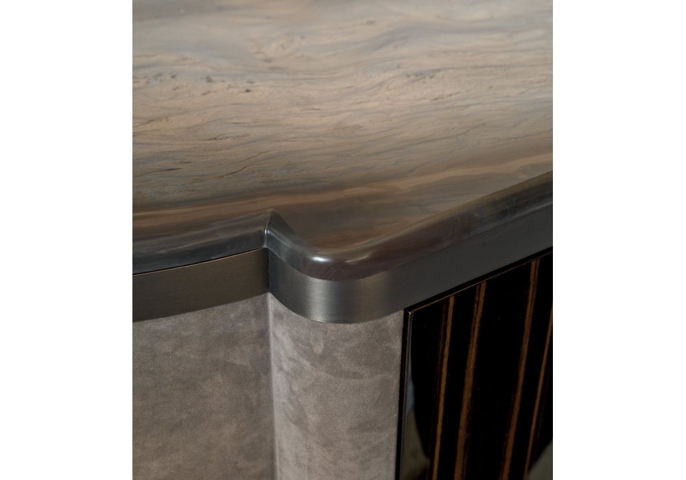Julian firmato da Giusseppe Iasparra per Longhi è un mobile contenitore con ante frontali in legno lucido o opaco, fianchi curvi laterali con rivestimento in pelle e base in metallo. Il piano è in marmo o legno di ebano opaco con intarsio. Bordo sottopiano nella stessa finitura della base oppure su richiesta rivestita in pelle. Maniglie in metallo scanalato.