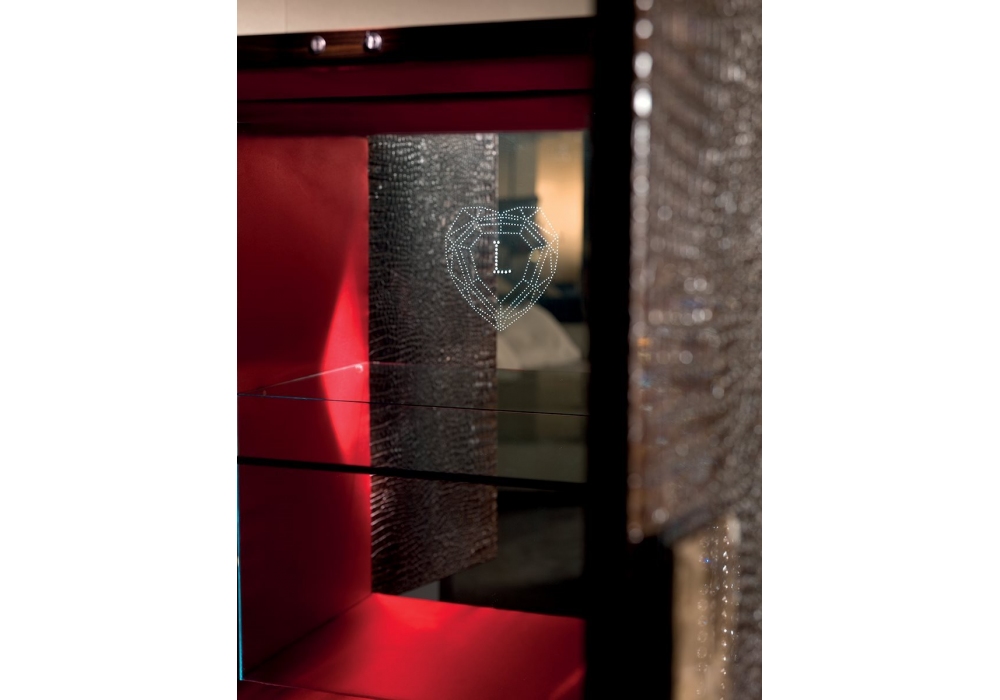 Lady firmato da Giuseppe Viganò per longhi è un mobile alto con struttura in legno in essenza o laccato lucido, ante in legno con rivestimento in pelle o cashmere con maniglie in marmo. Interno rivestito in raso con un ripiano in vetro, ed illuminato con luci led. Base in metallo rettificato.