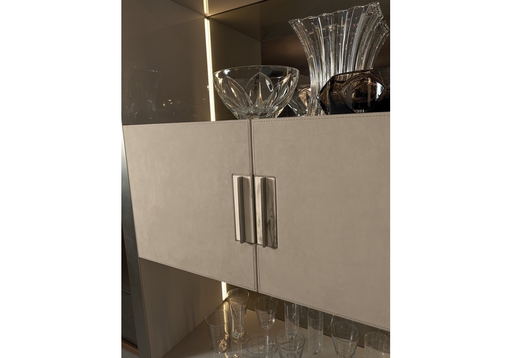 Orwell Firmato da Giuseppe Viganò per Longhi è un mobile alto con base e cornice in metallo rettificato, struttura in legno in essenza o laccato lucido e rivestimento antine centrali in pelle o cashemere. Maniglia in marmo. Sui lati dello schienale sono applicati due strip led dimmeabili con accensione a sfioramneto touch, che illuminano la parte interna del mobile.