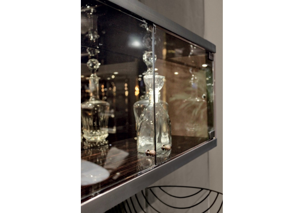 Courbet firmato da Giuseppe Viganò per Longhi è un mobile contenitore con base in metallo verniciato color bronzo, struttura rivestita in pelle e parti metalliche (bordo inferiore e superiore) in metallo rettificato. Piano in marmo o legno in essenza. Aperture push-pull e interno verniciato bronzo. L’interno dell’elemento terminale rotondo e dell’isola è laccato lucido color cipria ed è presente un vassoio rotante rivestito in pelle e un punto luce a led ad accensione automatica. Su richiesta i moduli centrali possono essere realizzati in legno in essenza.