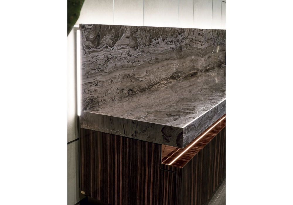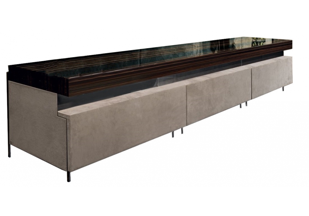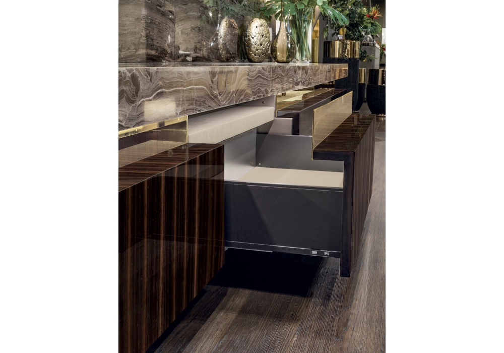Terrance firmato da Giuseppe Viganò per Longhi è un mobile contenitore con gambe in metallo verniciato bronzo, cassetti superiori in legno in essenza, laccati lucidi o in pelle. Aperture push-pull e gola interna del cassettone in metallo rettificato in differenti finiture. Illuminazione gola interna a led dimmerabile con accensione tramite interruttore a sfioramento touch. Interno verniciato bronzo e fondale cassettone in pelle. Piano in marmo o legno. Disponibile nella versione con o senza schienale in marmo con illuminazione a led. L’effetto è un fascio di luce che illumina la parete.