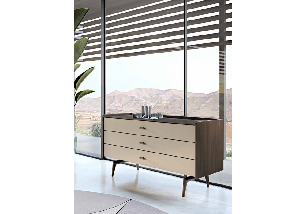 Blues firmata da Giuseppe Viganò per Turri è una cassettiera con struttura in legno di noce impiallacciata e gambe in massello di noce. I frontali possono essere realizzati in legno di noce impiallacciato o rivestiti in pelle. Piano in marmo, pelle o noce impiallacciata.